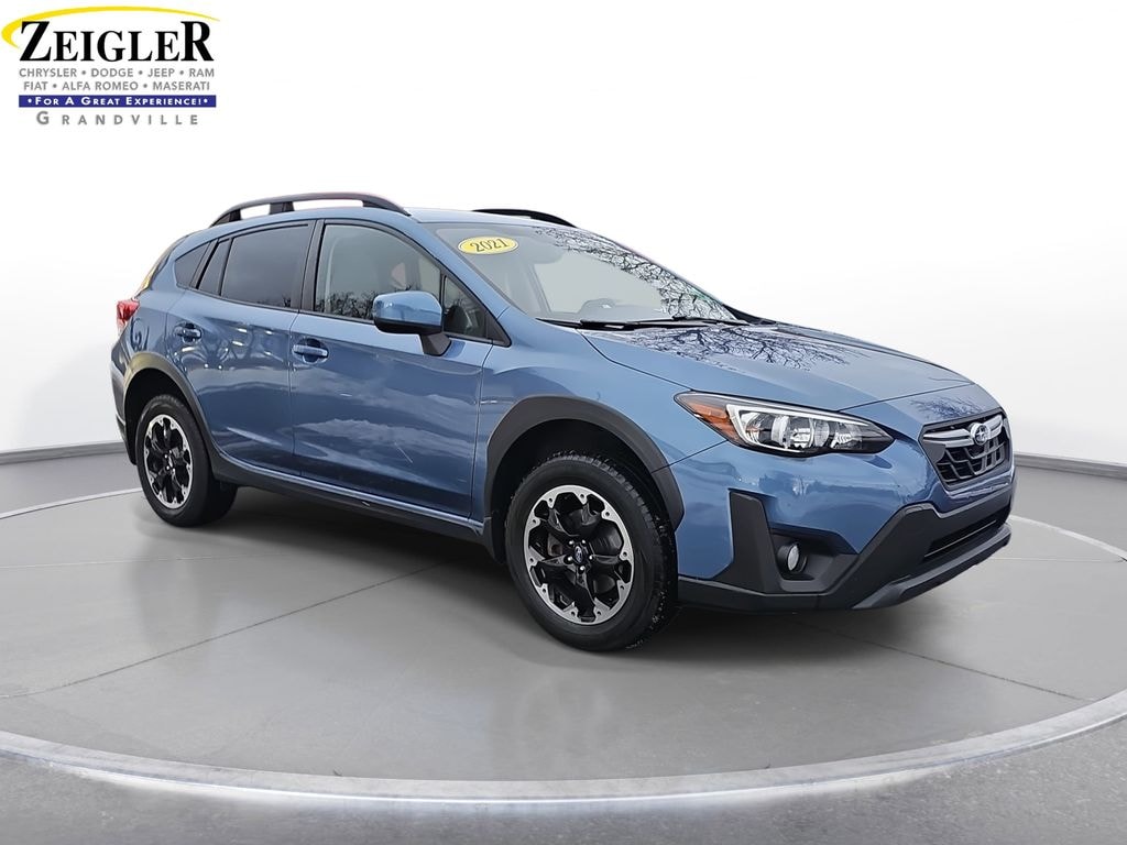 Certified. 2021 Subaru Crosstrek Premium Horizon Blue Pearl 17" Alloy Wheels, 3.90 Axle Ratio, 4-Wheel Disc Brakes, 6 Speakers, 6-Way Power Driver's Seat, ABS brakes, Air Conditioning, All-Weather Floor Liners, Alloy wheels, AM/FM radio: SiriusXM, Anti-whiplash front head restraints, Auto-Dimming Mirror w/Compass & HomeLink, Automatic temperature control, Blind Spot Detection (BSD), Brake assist, Bumpers: body-color, CD player, Cloth Upholstery, Driver door bin, Driver vanity mirror, Dual front impact airbags, Dual front side impact airbags, Electronic Stability Control, Emergency communication system: STARLINK Safety and Security (Subscription Required), Exterior Parking Camera Rear, EyeSight System, Four wheel independent suspension, Front anti-roll bar, Front Bucket Seats, Front Center Armrest, Front fog lights, Front reading lights, Fully automatic headlights, Heated door mirrors, Heated Front Bucket Seats, Heated front seats, Illuminated entry, Keyless Access w/Push-Button Start, Knee airbag, Leather Shift Knob, Low tire pressure warning, Moonroof Package, Occupant sensing airbag, Outside temperature display, Overhead airbag, Overhead console, Panic alarm, Passenger door bin, Passenger vanity mirror, Popular Package #2, Power door mirrors, Power Moonroof, Power steering, Power windows, Radio data system, Radio: Subaru STARLINK 6.5" Multimedia Plus System, Rear anti-roll bar, Rear Bumper Cover, Rear Seatback Protector, Rear window defroster, Rear window wiper, Remote keyless entry, Security system, Speed control, Speed-sensing steering, Splash Guards, Split folding rear seat, Spoiler, STARLINK/Apple CarPlay/Android Auto, Steering wheel mounted audio controls, Subaru STARLINK Smartphone Integration, Tachometer, Telescoping steering wheel, Tilt steering wheel, Traction control, Trip computer, Variably intermittent wipers.