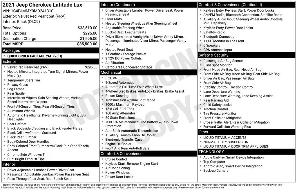 Elevate your driving experience with this stunning 2021 Jeep Cherokee Latitude Lux. Boasting a sleek Velvet Red Pearlcoat exterior, this SUV commands attention on the road. Under the hood, the powerful 3.2L V6 engine paired with a 9-Speed 948TE Automatic transmission and 4WD delivers an impressive blend of performance and efficiency, achieving 19 MPG in the city and 27 MPG on the highway.
